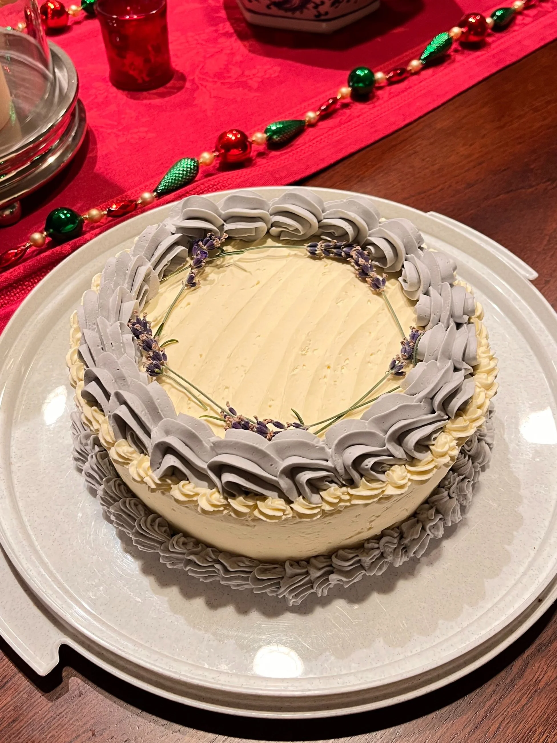 lemon olive oil cake, lemon curd, + lavender swiss meringue buttercream