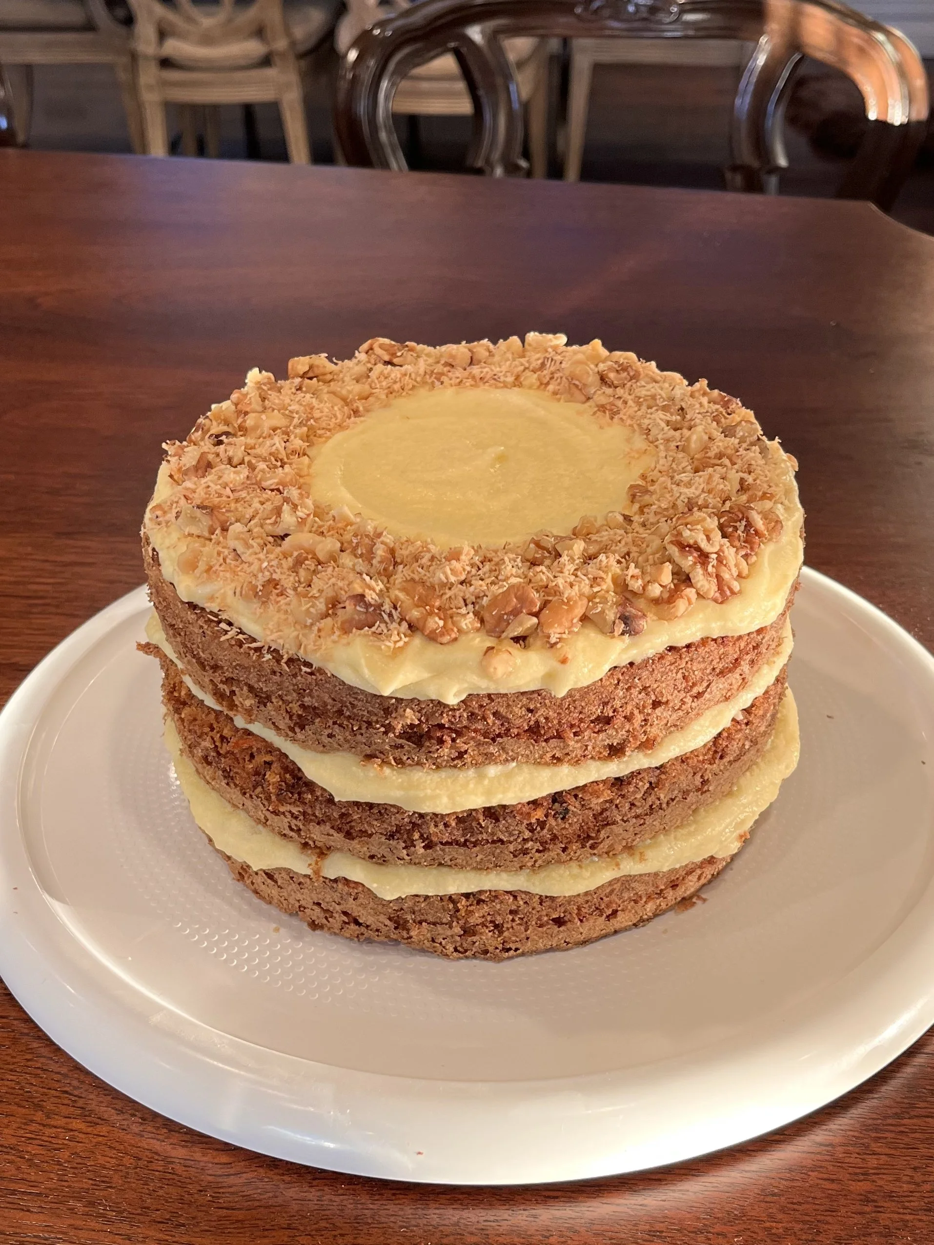 carrot cake, cream cheese frosting, toasted walnuts + coconut