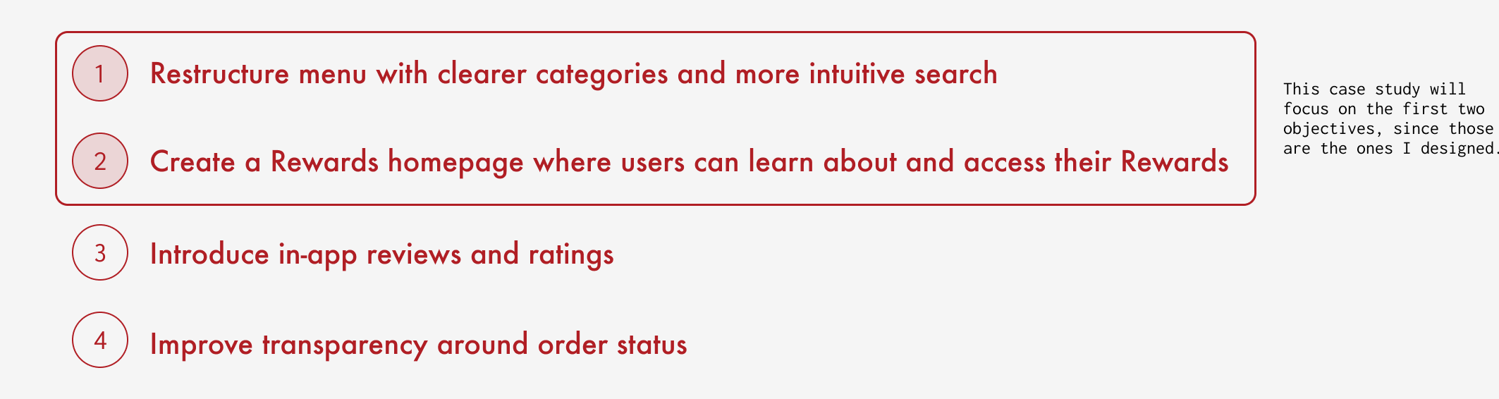 This project was a 3 month collaborative effort with a team of 4, completed under the supervision of the User Experience Design Certificate program at UCLA Extension. My role primarily focused on designing two flows: finding, learning about, and customizing menu items, and understanding and enrolling in the rewards program.
