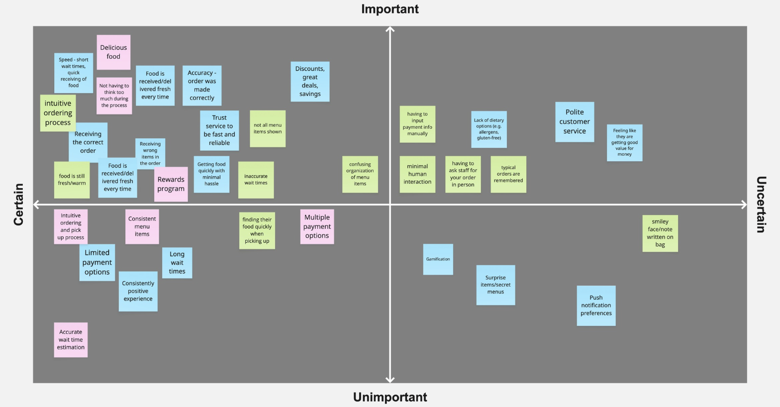 We began our project by conducting an assumptions mapping exercise, where we listed our assumptions about what customers expect, love and hate about the mobile ordering process. We got a better sense of what features might be most impactful to work on. Later on, our survey responses challenged or strengthened these ideas.