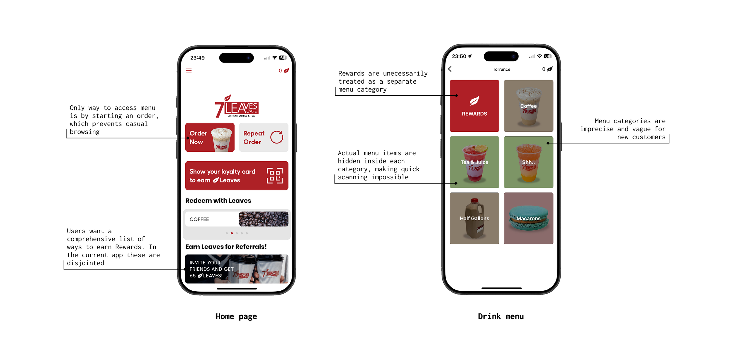 Finally, we synthesized our initial assumptions and user survey responses to complete a final analysis of the 7 Leaves app and its pain points: