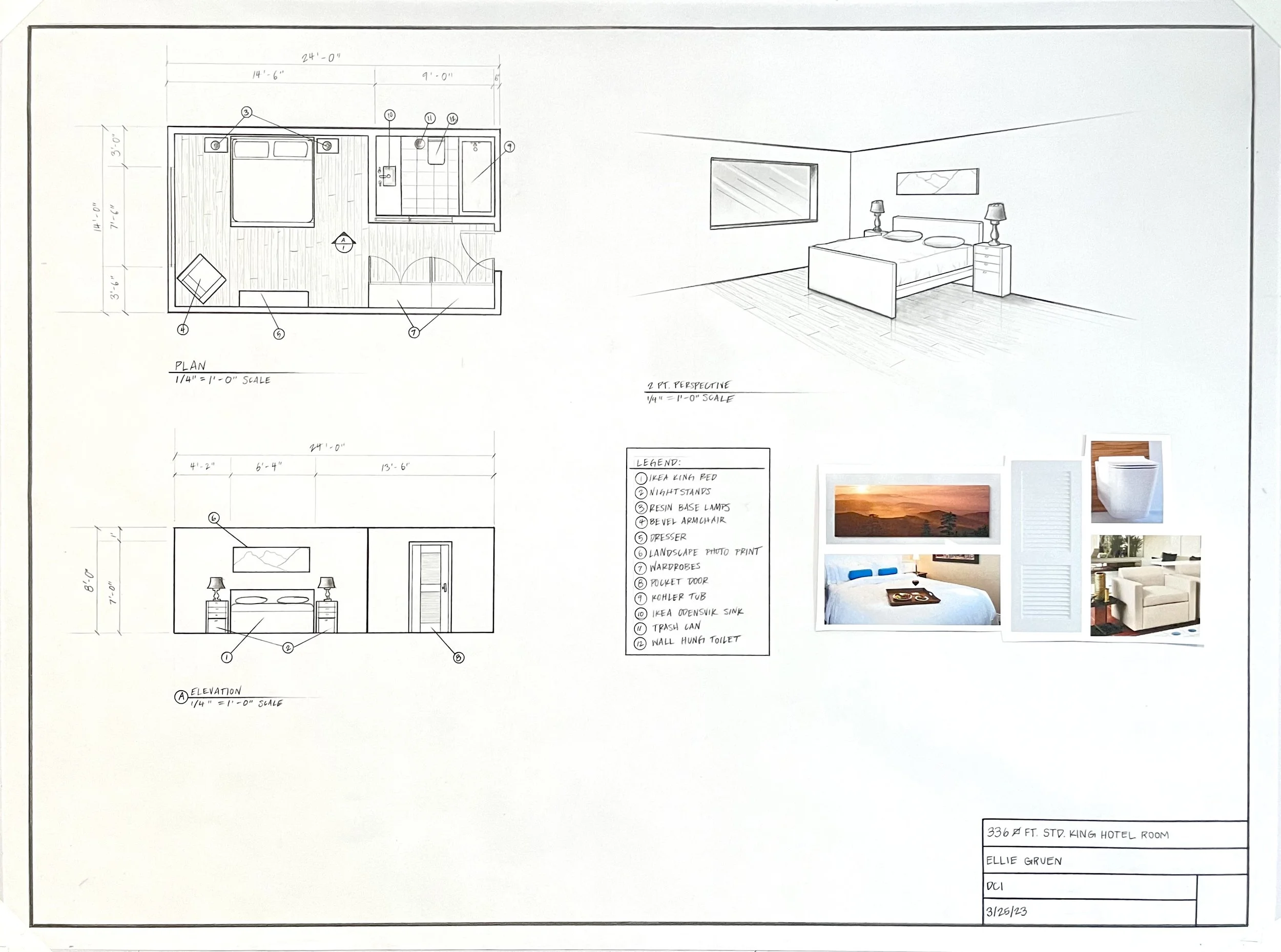 Plan, elevation, + 2 pt perspective std. king hotel room
